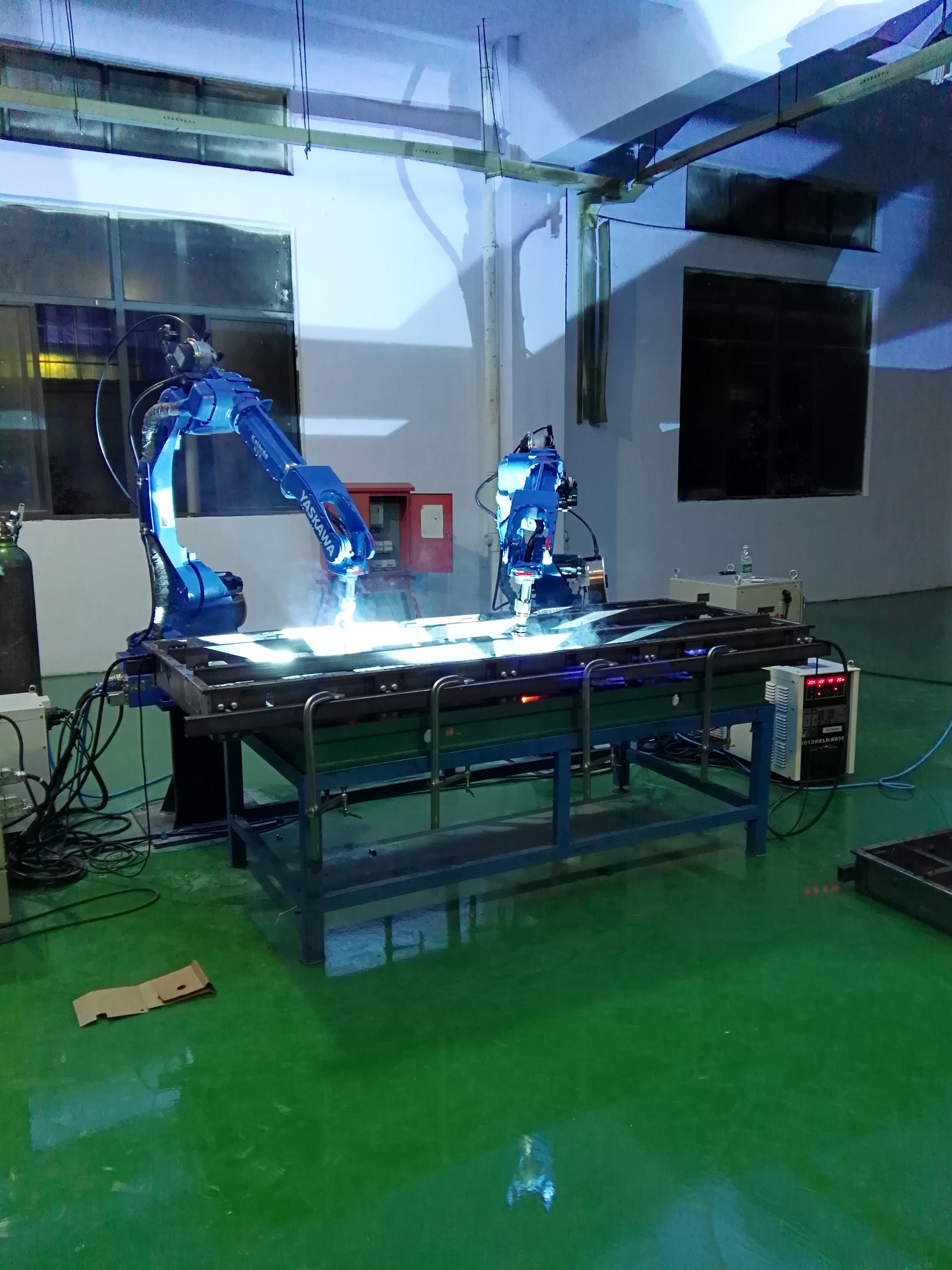 電池箱因為體積大,板薄等特點,易造成焊接機器人焊偏,焊破等現(xiàn)象,這也是大多數(shù)生產廠家沒有上焊接機器人的主要原因。針對電池箱這些特點,安川機器人的始端檢出功能在焊接有誤差的產品上得到了用武之地。始端檢出是通過焊接機器人的焊絲觸碰板材的水平面與垂直面計算出焊接位置發(fā)生的偏移量,從而調整焊接機器人編程時的位置,達到理想的焊接效果。通過增加始端檢出不僅大大提高工作效率,而且有效的保證了焊接質量,這也是安川焊接機器人用在新能源電池箱焊接上的主要原因之一。